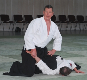 | Anlässlich eines Bundeslehrgangs erwarteten die Rheinland-Pfälzer plus etliche Aikidoka aus den anderen Bundesländern in Frankenthal Meister Martin Glutsch vom SV Böblingen. Er kam und brachte die große Menge an Teilnehmern an beiden Tagen gut ins Schwitzen. Gut erklärt und teilweise praxisnah - aus eigener Erfahrung - zeigte er die Techniken des Kokyu-Nage, Tenchi-Nage sowie Messertechniken spielerisch und effektiv. So war auf Seiten der Teilnehmer Konzentration und Spaß dabei. |