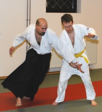 | Zum ersten Lehrgang in Amorbach lud der Verein Meister Edmund Kern ein, der dem Iwama-ryu von Saito Sensei folgt. Bei den Techniken mit der leeren Hand vermittelte er sehr eindrucksvoll, wie Techniken aus Standpositionen ganz ohne Kraft effektiv ausgeführt werden können. Die im Iwama-ryu (von Ueshiba Sensei) festgelegten Formen mit dem Jo und dem Bokken zeigte Meister Kern Schritt für Schritt mit hoher Exaktheit. |